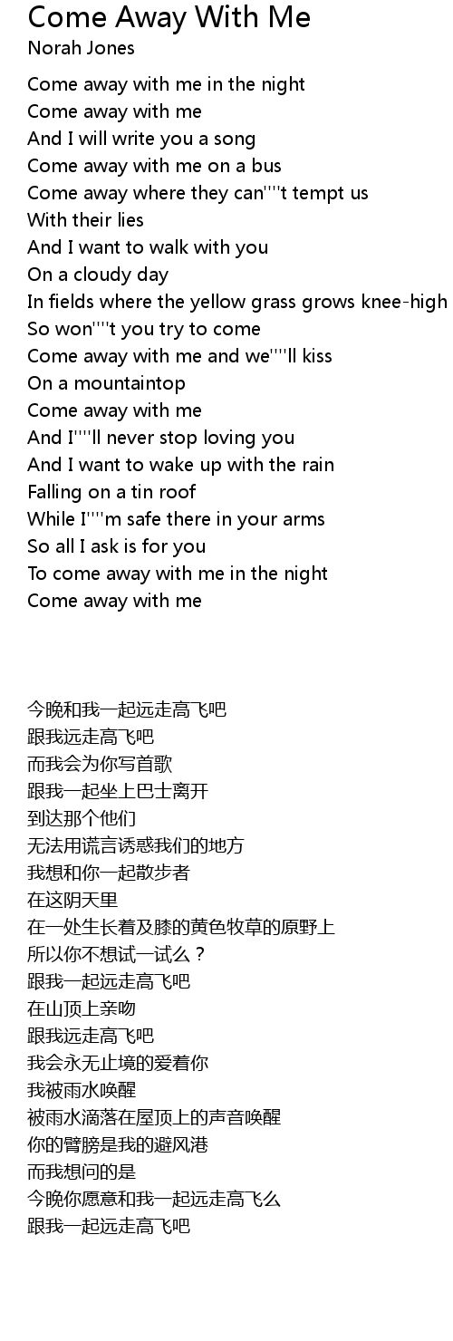 Come Away With Me - I want to walk with you on a cloudy day in fields where the yellow and i want to wake up with the rain falling on a tin roof while i'm safe there in your arms so all i ask is for you to come away with me in the night.. And i want to walk with you on a cloudy day in fields where the and i want to wake up with the rain falling on a tin roof while i'm safe there in your arms so all i ask is for you to come away with me in the night. Come away with me on a bus come away where they can't tempt us with their lies. Come away where they can't tempt us. Something has to make you run i don't know why i didn't come. And i will write you a song.