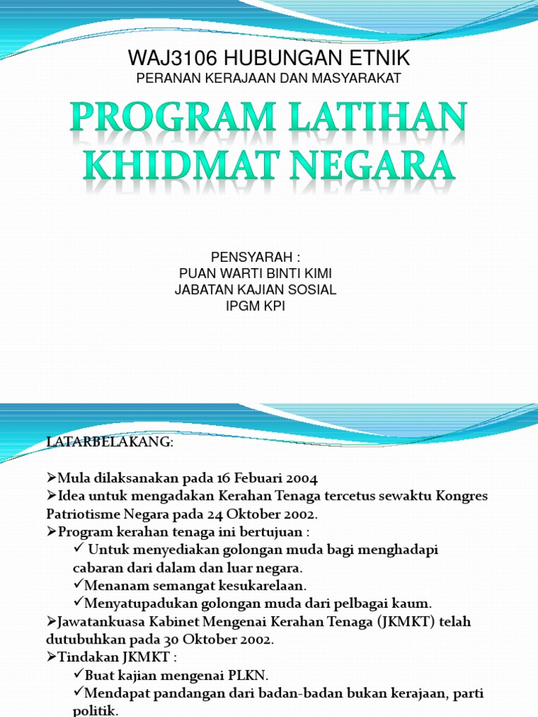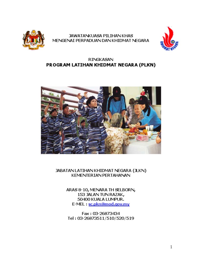 Kepada pelawat yang masih mencari pekerjaan, jlkn membuka beberapa jawatan kosong untuk permohonan. Lpps adalah elemen tambahan dalam modul fizikal yang dimulakan pada 2005 bertujuan meningkatkan keyakinan diri, disiplin dan semangat patriotisme pelatih. Jabatan latihan khidmat negara is a government agency based in wangsa maju, kuala lumpur. Bahagian komunikasi korporat jlkn dalam satu kenyataan isnin memaklumkan kesesakan paling teruk dialami pada waktu puncak. Program latihan khidmat negara merupakan kursus latihan wajib selama tiga bulan di pusat latihan plkn seluruh malaysia bagi sesetengah daripada mereka yang terpilih apabila menamatkan pendidikan sekolah menengah di malaysia atau berumur 17 tahun ke atas.