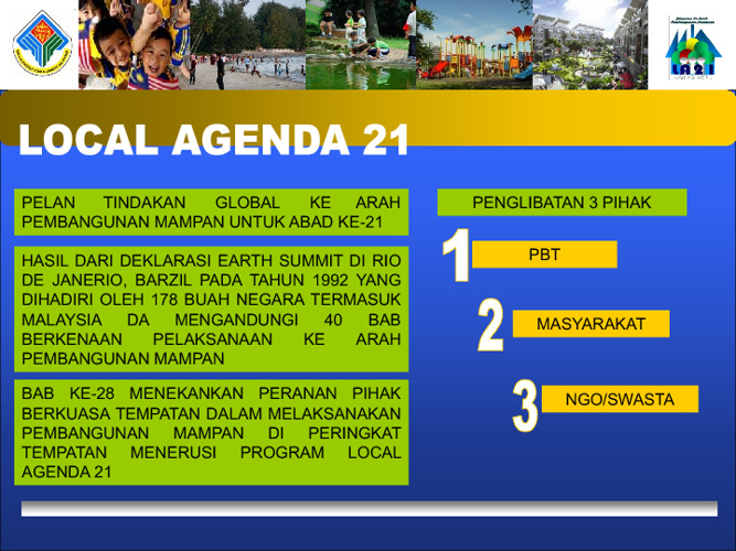 Related : Local Agenda 21 Malaysia - The pilot programme aims at promoting sustainable development at the local level by creating and strengthening participation between local authorities, local communities and the private sector..