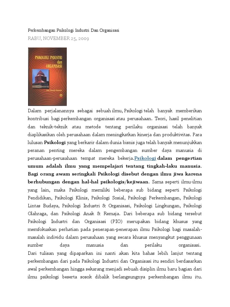 Psikologi industri dan organisasi baru ada sekitar satu abad terakhir. 4 lingkup pio ruang lingkup psikologi industri dan organisasi (pio) apa saja lingkup kerja pio? Penilaian kinerja menjadi dasar bagi organisasi untuk melakukan tindakan tertentu bagi individu. Sebelum saya maupun pembaca memulai segala kegiatan apapun,khususnya mengerjakan tugas baiknya kita dahulukan untuk berdoa terlebih dahulu supaya saya maupun pembaca bisa dengan mudah dan lancar untuk mengerjakan tugasnya dengan baik. 1 psikologi industri dan organisasi pertemuan 1 sri hastuti handayani, m.si, psi.