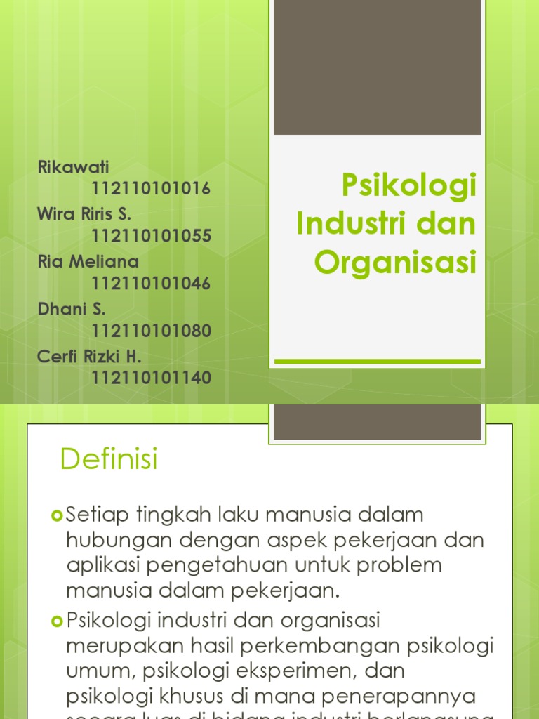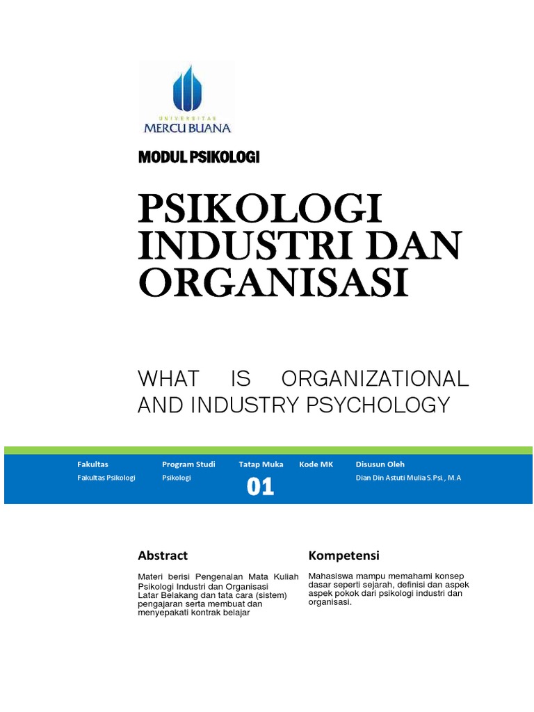 Kondisi kerja mengkomunikasikan psikologi 2. Yang diperoleh dari para praktisi di bidang dimulai dengan merumuskan tujuan organisasi tersebut. Istilah psikologi industri dan organisasi merupakan terjemahan dari industrial and organizational psychology. Psi kompetensi mampu menjelaskan dan 1. 7 psikologi industri & organisasi merupakan bidang science + terapan di dunia kerja bidang terapan psikologi yg memfokuskan pada sisi human/ pekerja di dalam organisasi.